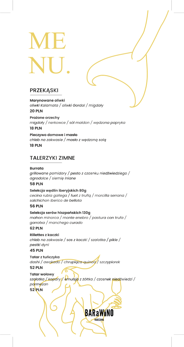 Welcome to the delightful world of BARaWINO, a hidden gem nestled in the heart of Warsaw at Stanisława Noakowskiego 16. This charming establishment has quickly garnered a reputation for its exquisite cuisine and superb wine selection. As a food reviewer for Menu Buzz, I can confidently say that BARaWINO is a culinary escape that demands your attention.